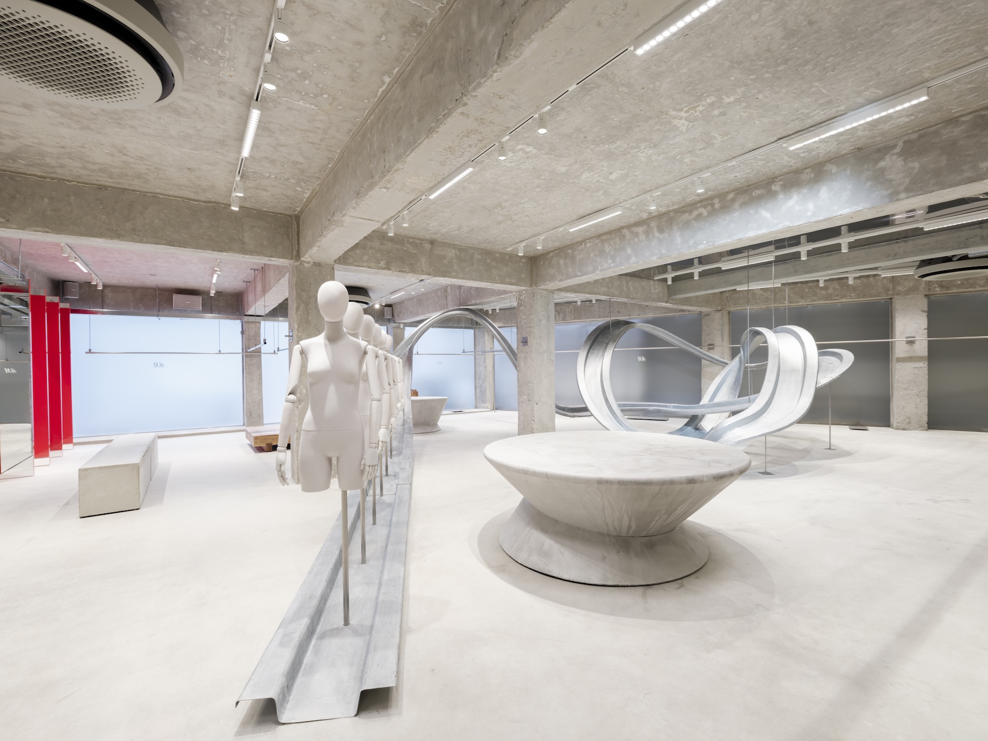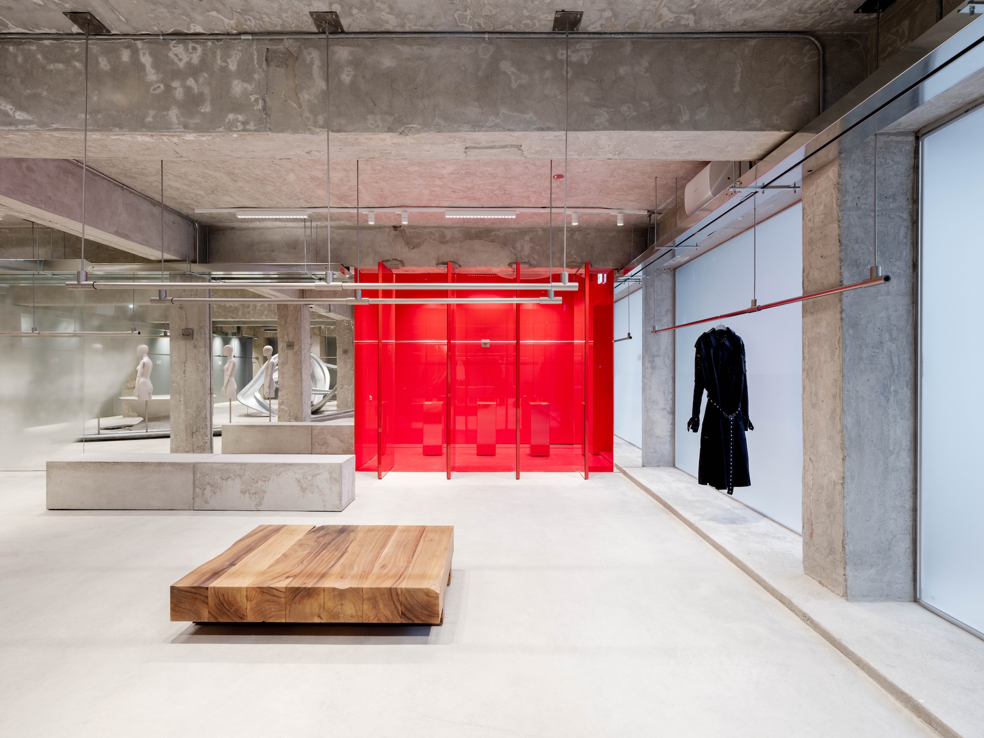 A bright red ampersand symbol marks the entrance to the store. Upon entering, visitors find themselves in a red foyer, which introduces the different ‘scenes’. On the ground floor, shoppers encounter an open-plan interior punctuated by concrete columns – features of the original structure. A sculptural clothing rack, made from old guard rails, complements the stripped-back, industrial aesthetic. Red accents reinforce the H&M branding throughout.