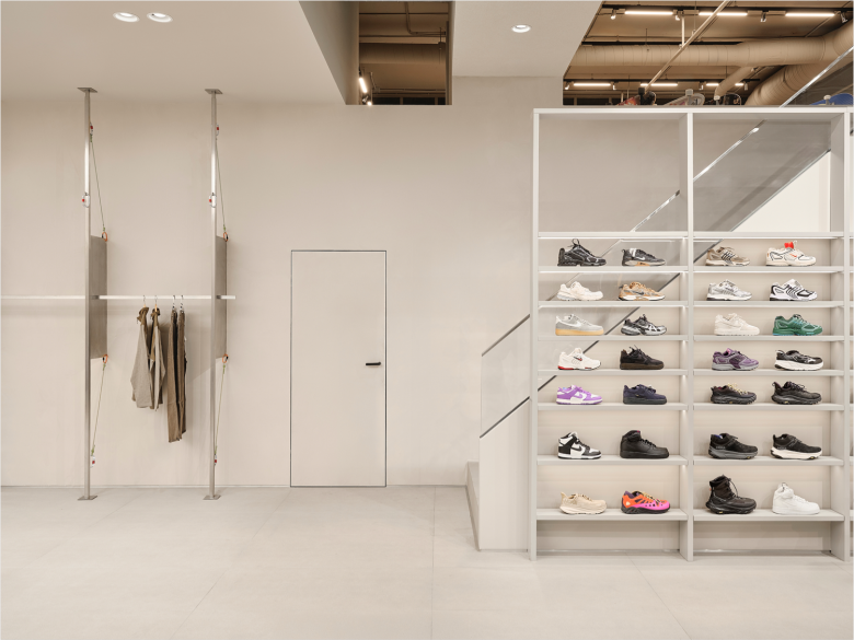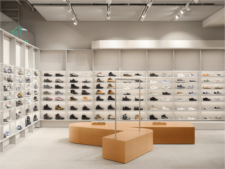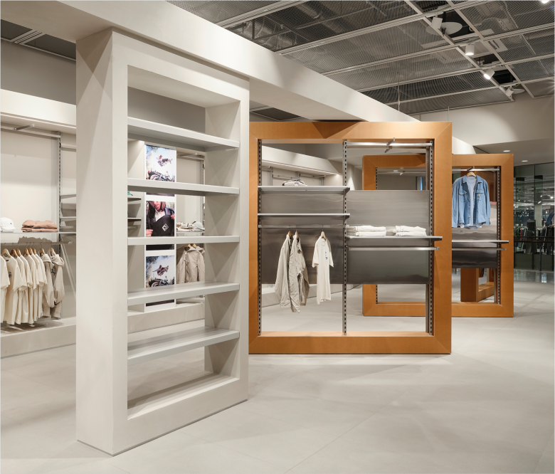 Nach dem Abriss eines Zwischengeschosses wurde ein monochromer Hintergrund aus Putz, MDF und Keramikfliesen geschaffen, der die Großzügigkeit des Raums maximiert und zugleich alle Ladenbereiche miteinander verbindet. Um den einladenden Charakter des Designs zu betonen, wurde eine weichere und wärmere – gleichzeitig aber sehr funktionale – Beleuchtung gewählt, umgesetzt durch Spotlights, Oberlichter und Lichtstreifen, die in die Regale integriert sind.